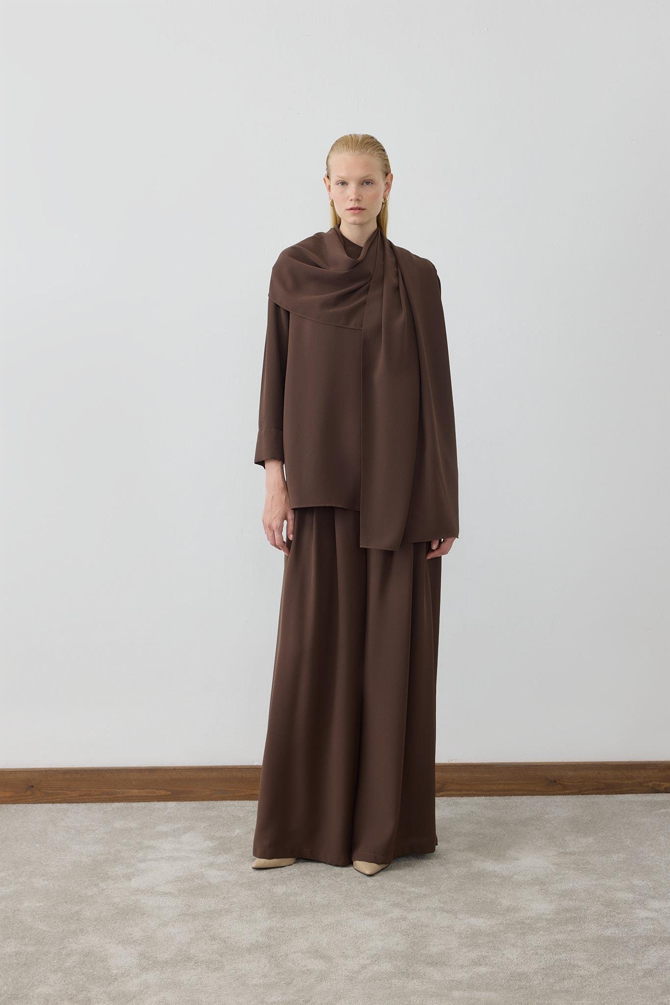 EVA KREP ŞALLI BLUZ - PALAZZO PANTOLONLU TAKIM KAHVE