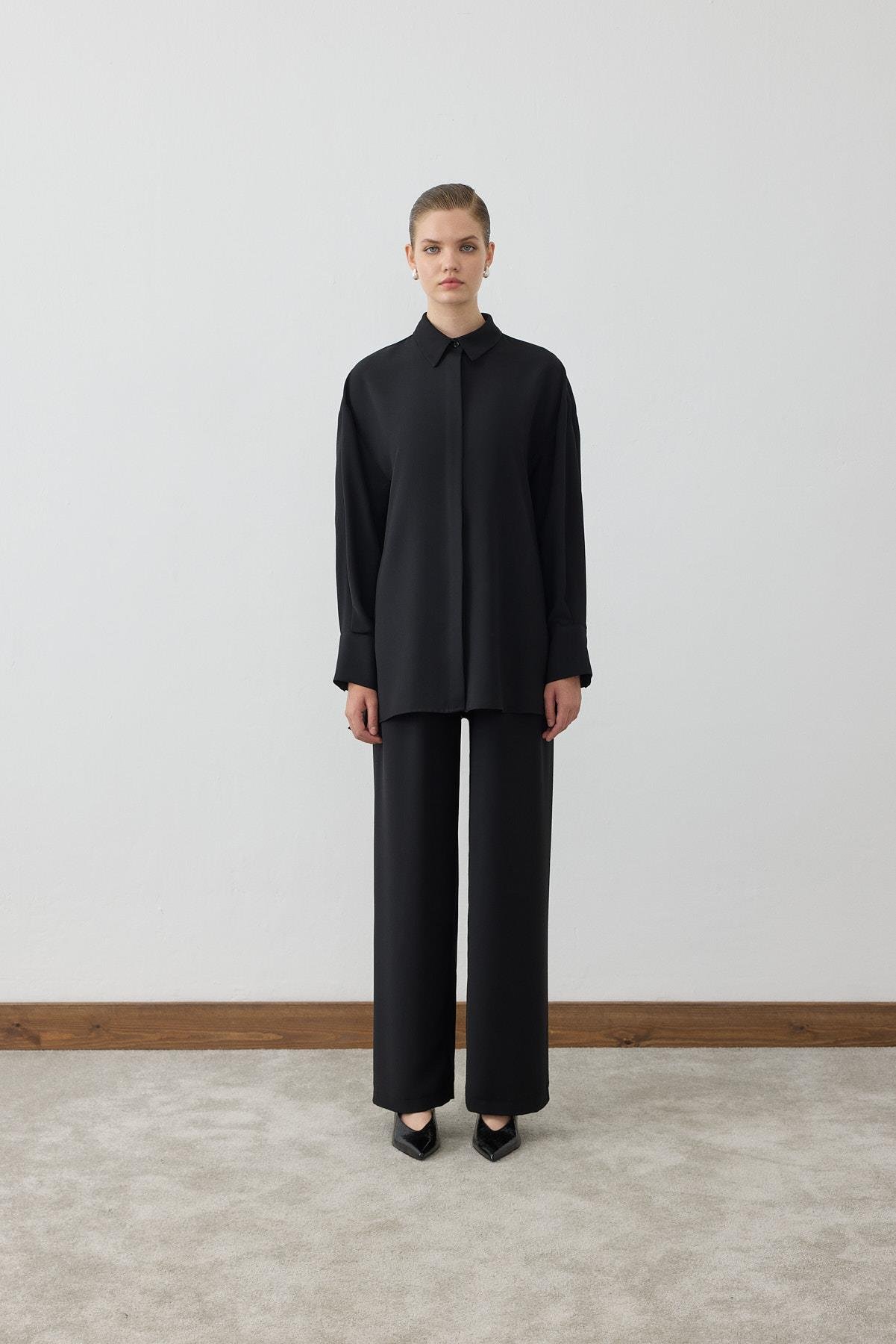 MİORİ LİNZA PLİSE GÖMLEKLİ PANTOLONLU KREP TAKIM SİYAH