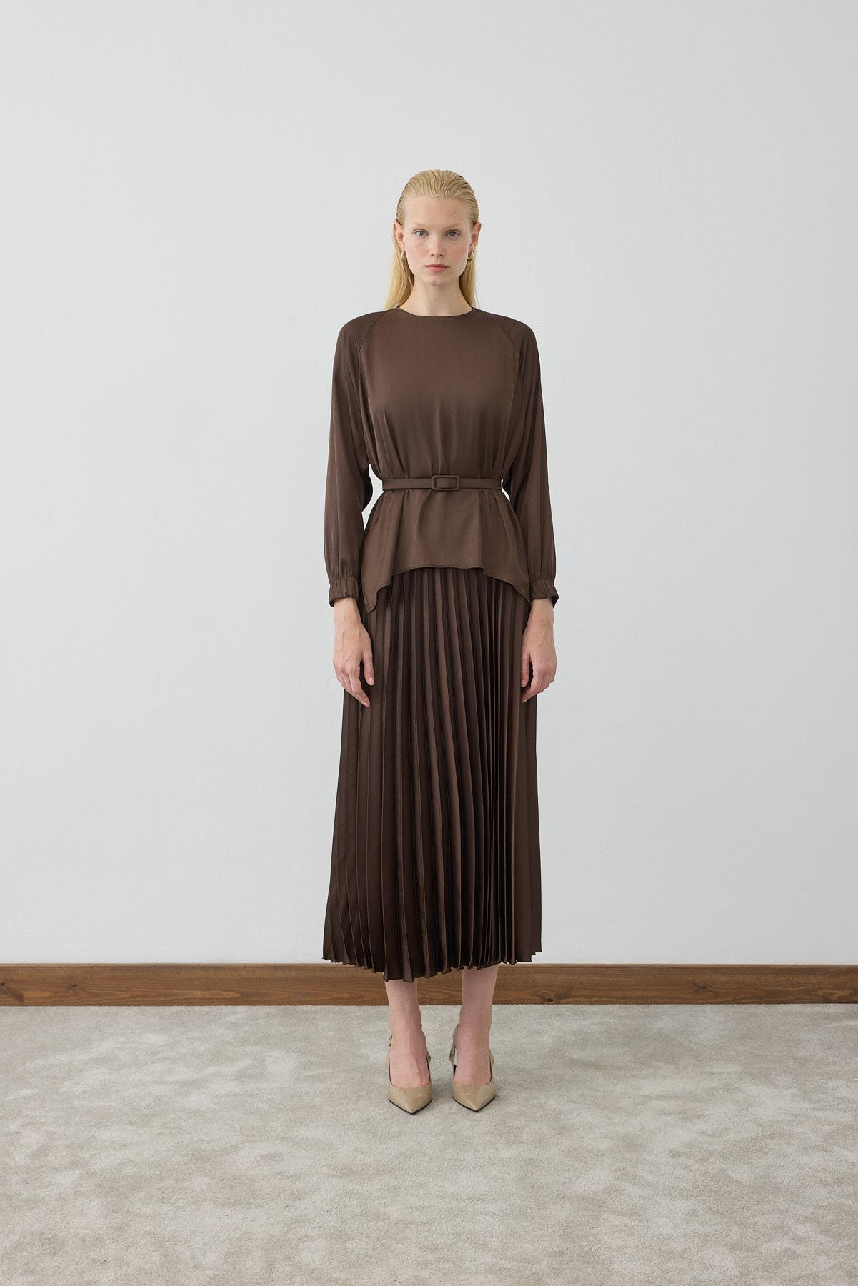 MİORİ NORA SATEN PLİSE ETEKLİ TAKIM KAHVE
