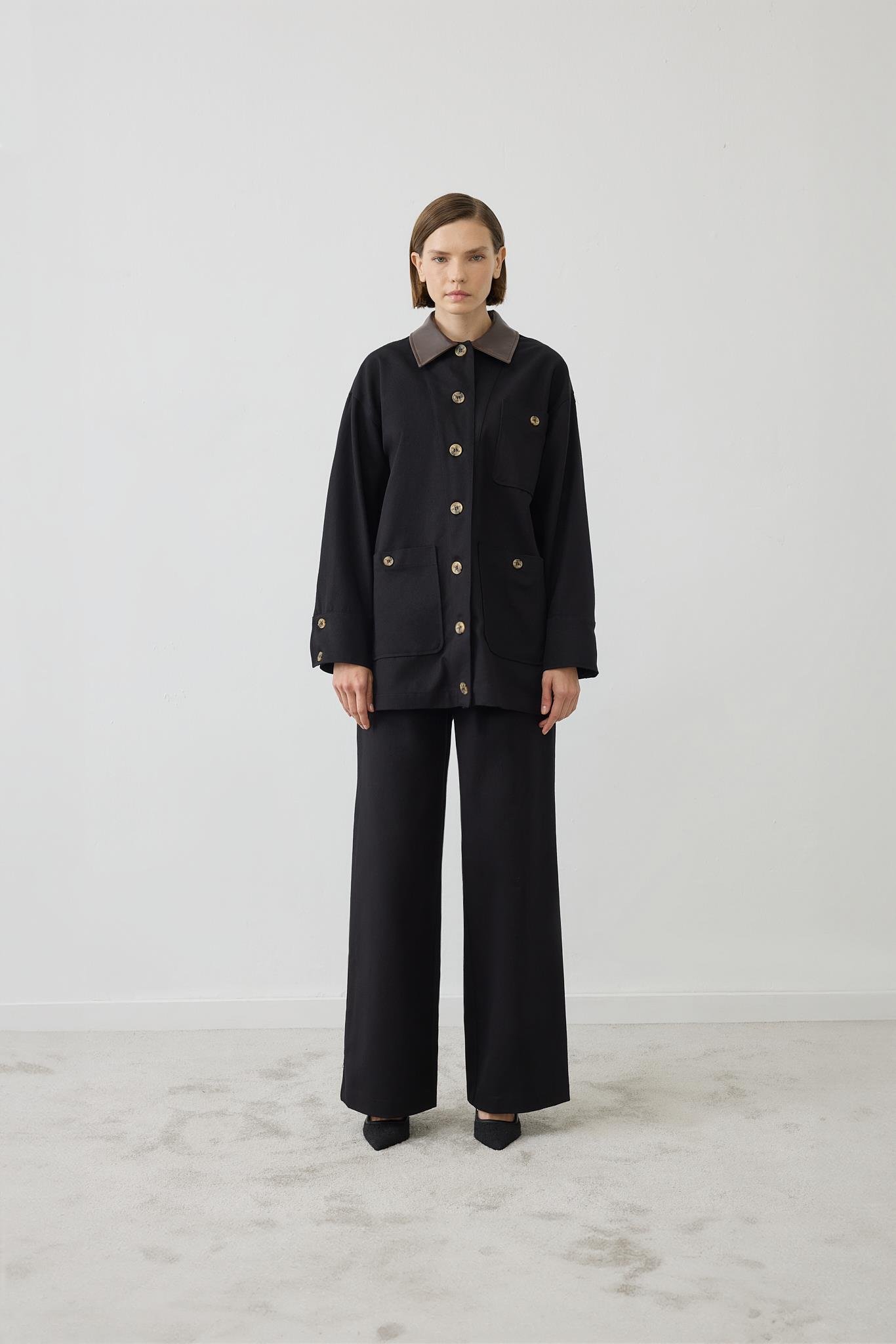 OVEL DERİ YAKA DETAY PANTOLONLU TAKIM SİYAH (TD26K05000042)