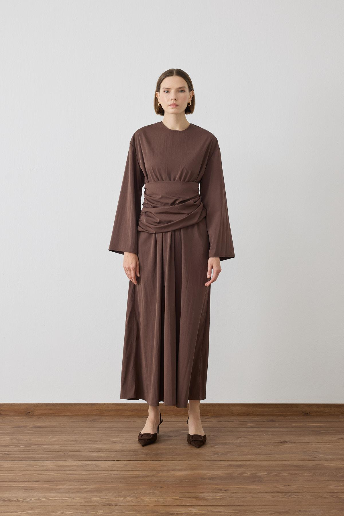 ROSE BÜZGÜLÜ DETAYLI ELBİSE KAHVE (TD26K31000007)
