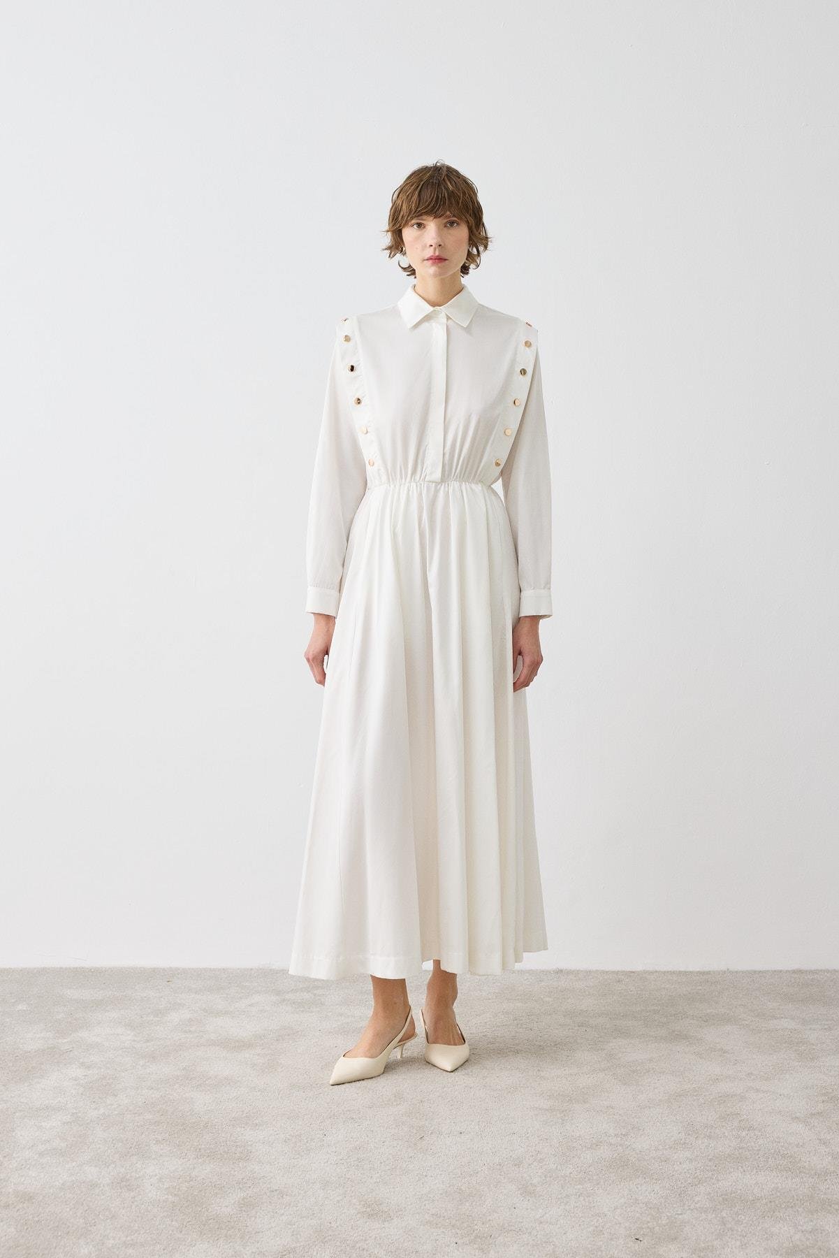 TESS DÜĞME DETAYLI KOTON ELBİSE BEYAZ